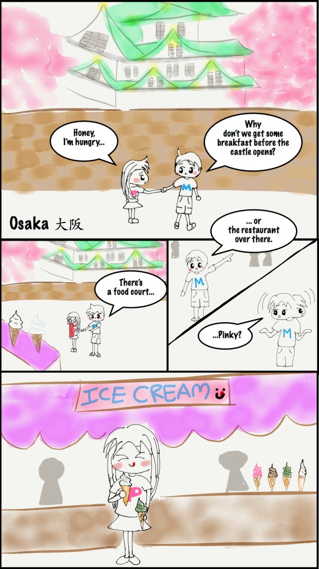 We were in Osaka. We wanted to visit Osaka Castle early, so we arrived to get tickets before it opened. While we were looking for somewhere to eat breakfast, Pinky saw something that caught her eye…