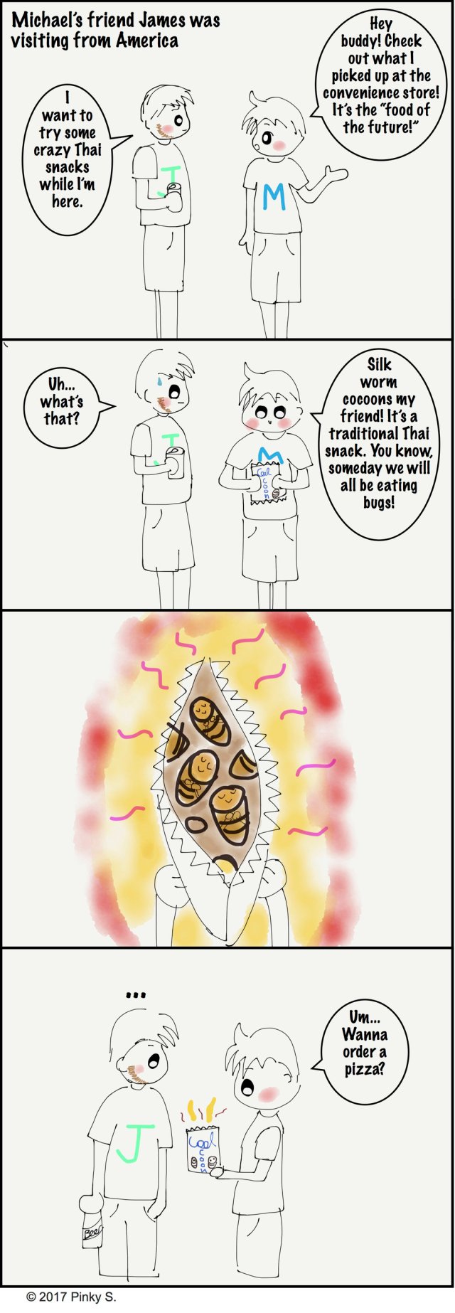 I bought several snacks from my 7-11 convenience store next door. Excited, we opened the bag of cocoons… but when we saw them, we just couldn’t do it. They were a lot bigger than I expected…