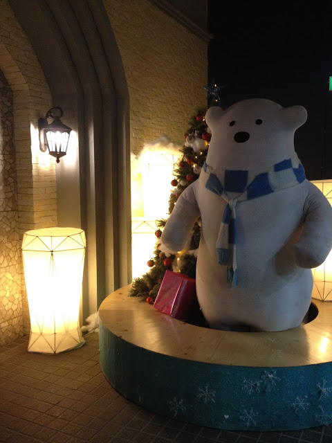 Well, I say snow. It’s more like shaved ice. Walking onto the crunchy field is like walking on a big snow cone. So you can’t exactly build a snowman or make a snow angel, but you can rent a toboggan and slide around on the ice. Of course, around Christmas time it’s mostly a fun photo-op for couples and families. Inside Snow Town, the temperature is probably around 50-60 degrees F (10-15 C).